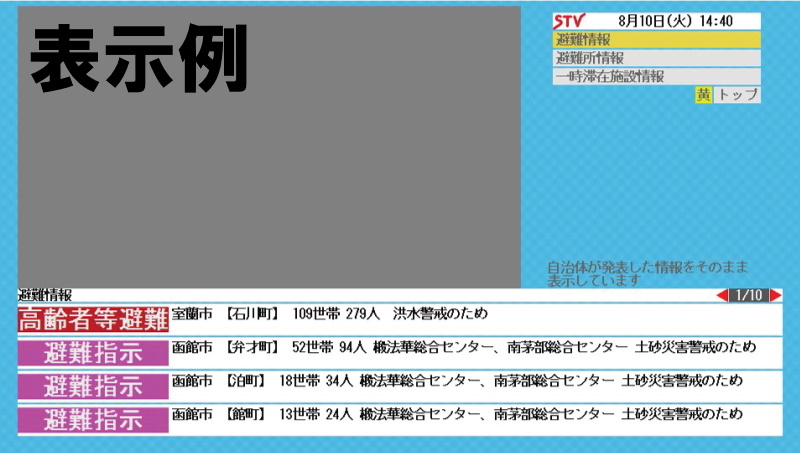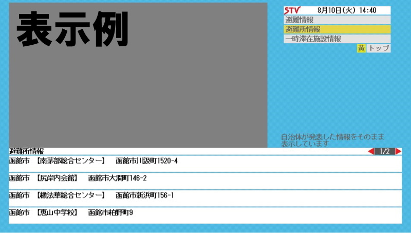 災害発生時にデータ放送(dボタンから)では避難指示などの情報、避難所の開設情報、一時滞在施設情報をお知らせします。