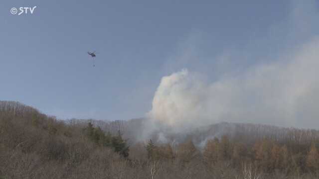通報からおよそ6時間たったいまでも燃え続けていて、道は午後4時半ごろに自衛隊に災害派遣を要請し、自衛隊のヘリコプターも加わって消火活動が行われる予定です。