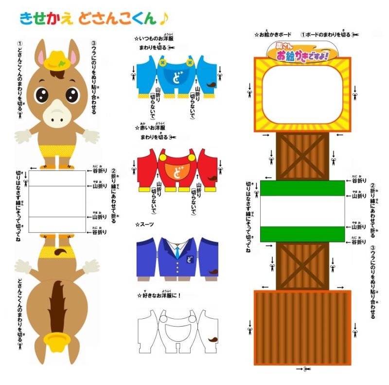 ●印刷した紙から「どさんこくん」、「お洋服」、「お絵かきボード」を切り抜きます。
