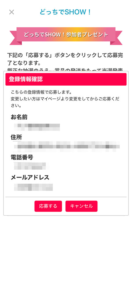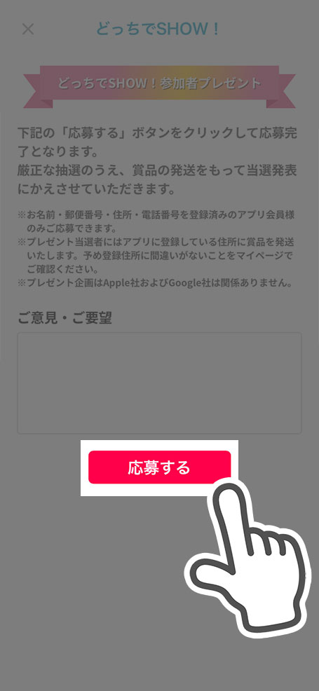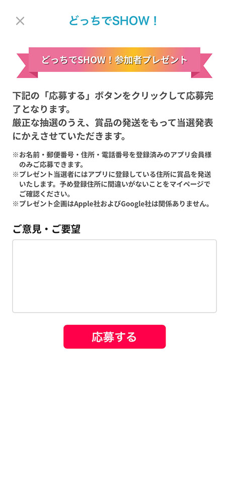 • 名前・郵便番号・住所・電話番号を登録済みのアプリ会員様のみご応募可能です。