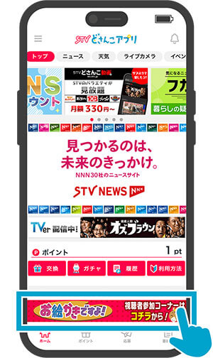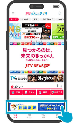 • 番組放送中にアプリを起動して、トップ画面下部にある【どさんこ世論調査】ボタンをタップしてください。