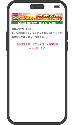 会員の皆様に感謝の気持ちを込めて、総額30万円分の温泉宿泊券が当たるキャンペーンを実施いたします。